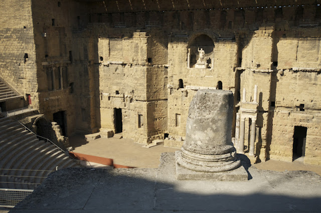 Mom and I took are first P Day in four weeks so we went up to Orange to see the Ancient Roman Theater. We were supposed to see it when we went up to Couples Conference, but we needed to get back to attend a young adult activity so we didn't see it. Orange and Avignon are only an hours drive from our house. Since we were by ourselves we took our time and had a nice day in Orange. This theater was constructed in about 10 BC under the rule of Augustus Caesar. Much of it original beauty is gone now. The Visigoths had there way with it. They still perform here, classical music, theater and Opera only! Phantom of the Opera played here last season. This holds 10,000 people. Even with my 10mm wide angle lens I couldn't get a good photo of it.